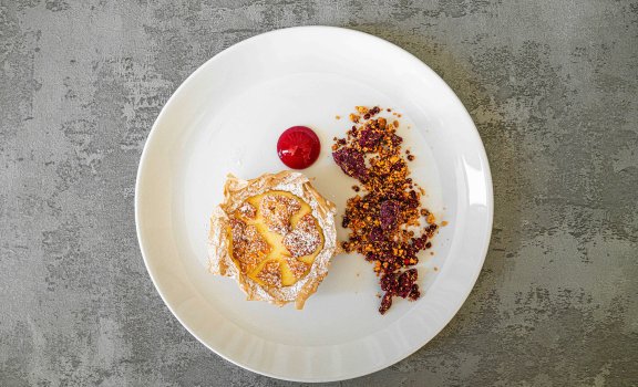 Deser: Drożdżówka zapiekana masłem i miodem gryczanym, lody jogurtowe, konfitura z borówek, kruszonka z palonej białej czekolady.